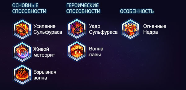 Усильте Сульфурас, чтобы мгновенно нанести урон по области и восполнить здоровье, призовите живой метеор, который нанесет урон при падении и покатится на врагов, подожгите себя или союзника взрывной волной, что поможет вам увеличить скорость передвижения и нанести дополнительный урон! С помощью особого таланта «Огненные Недра» вы сможете захватывать союзные и разрушенные форты и крепости. Вы также сможете высвободить свою истинную мощь и временно получить новые способности и недюжинный запас здоровья, который будет уменьшаться со временем.